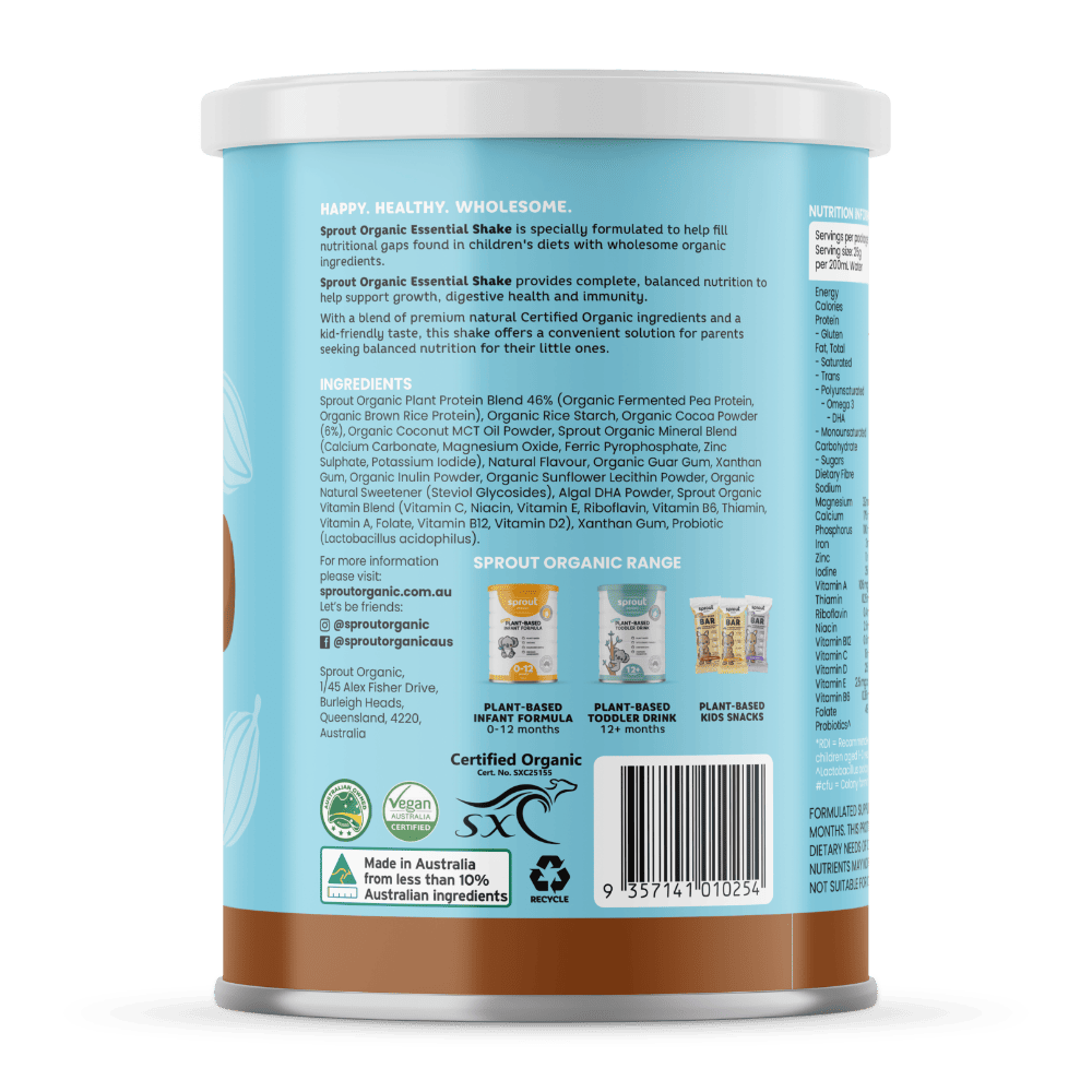 Sprout Organic Plant Protein Blend 46% (Organic Fermented Pea Protein, Organic Brown Rice Protein), Organic Rice Starch, Organic Cocoa Powder (6%), Organic Coconut MCT Oil Powder, Sprout Organic Mineral Blend (Calcium Carbonate, Magnesium Oxide, Ferric Pyrophosphate, Zinc Sulphate, Potassium Iodide), Natural Flavour, Organic Guar Gum, Xanthan Gum, Organic Inulin Powder, Organic Sunflower Lecithin Powder, Organic Natural Sweetener (Steviol Glycosides), Algal DHA Powder, Sprout Organic Vitamin Blend (Vitamin C, Niacin, Vitamin E, Riboflavin, Vitamin B6, Thiamin, Vitamin A, Folate, Vitamin B12, Vitamin D2), Xanthan Gum, Probiotic (Lactobacillus acidophilus).